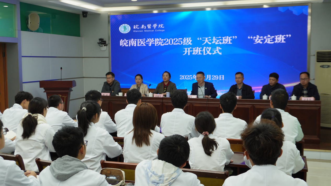 神经探微,天坛启智;精神溯源,安定筑梦。10月29日晚,学校2025级“天坛班”“安定班”开班仪式在滨江校区图书馆十楼报告厅举行。党委副书记、院长姚应水,党委常委、副院长余结根,北京安定医院芜湖医院党委书记沈棫华,北京天坛医院安徽医院副院长许杰等出席开班仪式。开班仪式由余结根主持。