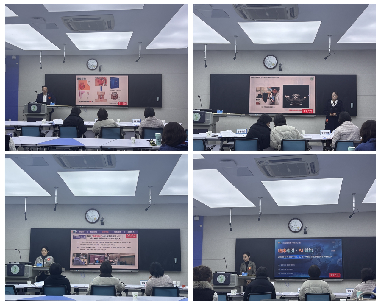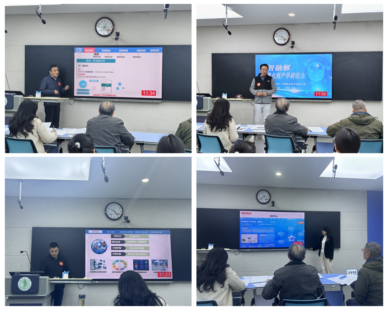 决赛现场特邀校教学督导组专家、往届省赛获奖教师及校外专家担任评审。参赛教师团队主讲教师围绕“以学生发展为中心”的教学理念,聚焦教学过程中的真实痛点,从教学理念与目标、教学内容设计、教学过程与方法、教学评价与成效等方面系统展示了课程教学改革与创新的探索与成果。评审专家严格对照评分标准,从教学目标精准度、结构设计逻辑性、课程思政融入度、考评反馈有效性及成果推广价值等维度进行深入点评,在充分肯定创新实践的同时提出针对性改进建议,为教师后续教学优化和备赛提供了有力指导。