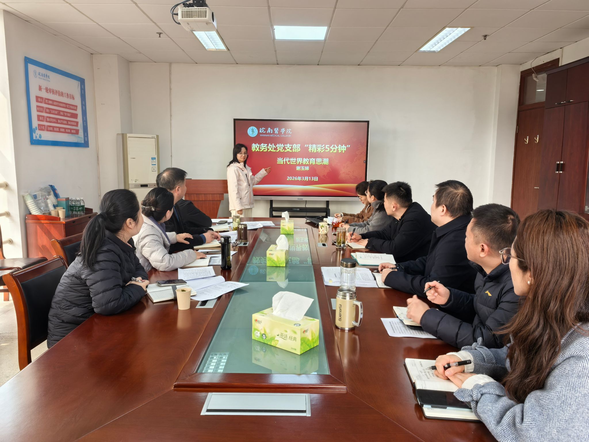 3月13日,教务处党支部开展特色品牌“精彩5分钟”分享。教务科副科长谢玉娣以当代世界教育思潮为主题,结合教务管理实际作微党课分享,党支部书记黄月娥主持会议,全体党员参加学习。