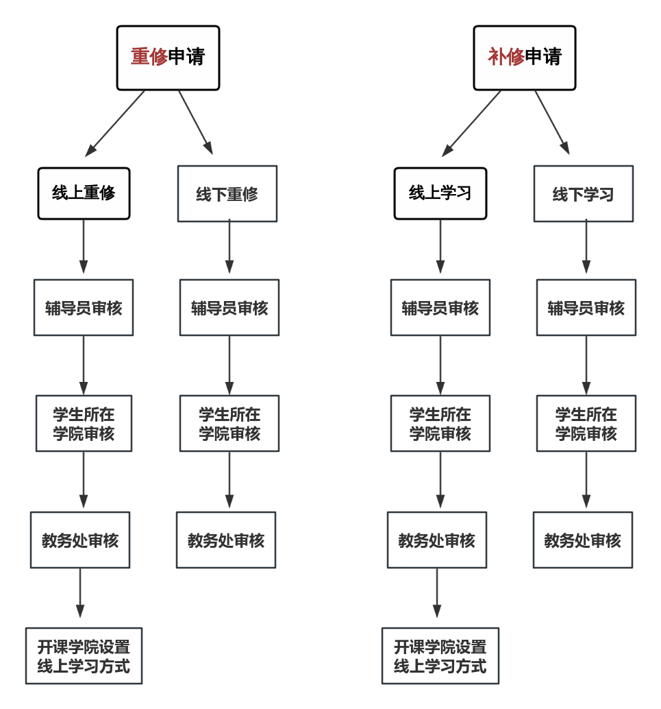 1.课程重修、补修一般选择跟随同专业相同课程所在班级学习,学习方式分为线上学习、线下学习两种方式,学生可根据自身情况自行选择。